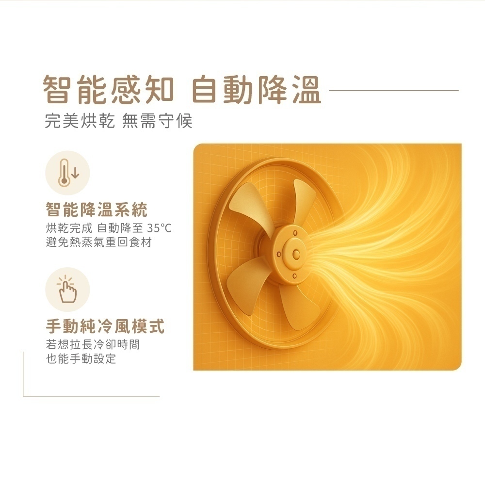 .自動降溫功能|烘乾完畢,自動偵測腔內溫度,低於 45 度才會停止風扇運轉;迅速降溫、避免回潮!.雙層防燙設計|內腔全金屬材質,外殼為耐高溫 PP 材質.小巧發酵利器|設定 30 度時,風扇幾乎靜止,方便用於 保溫 / 發酵