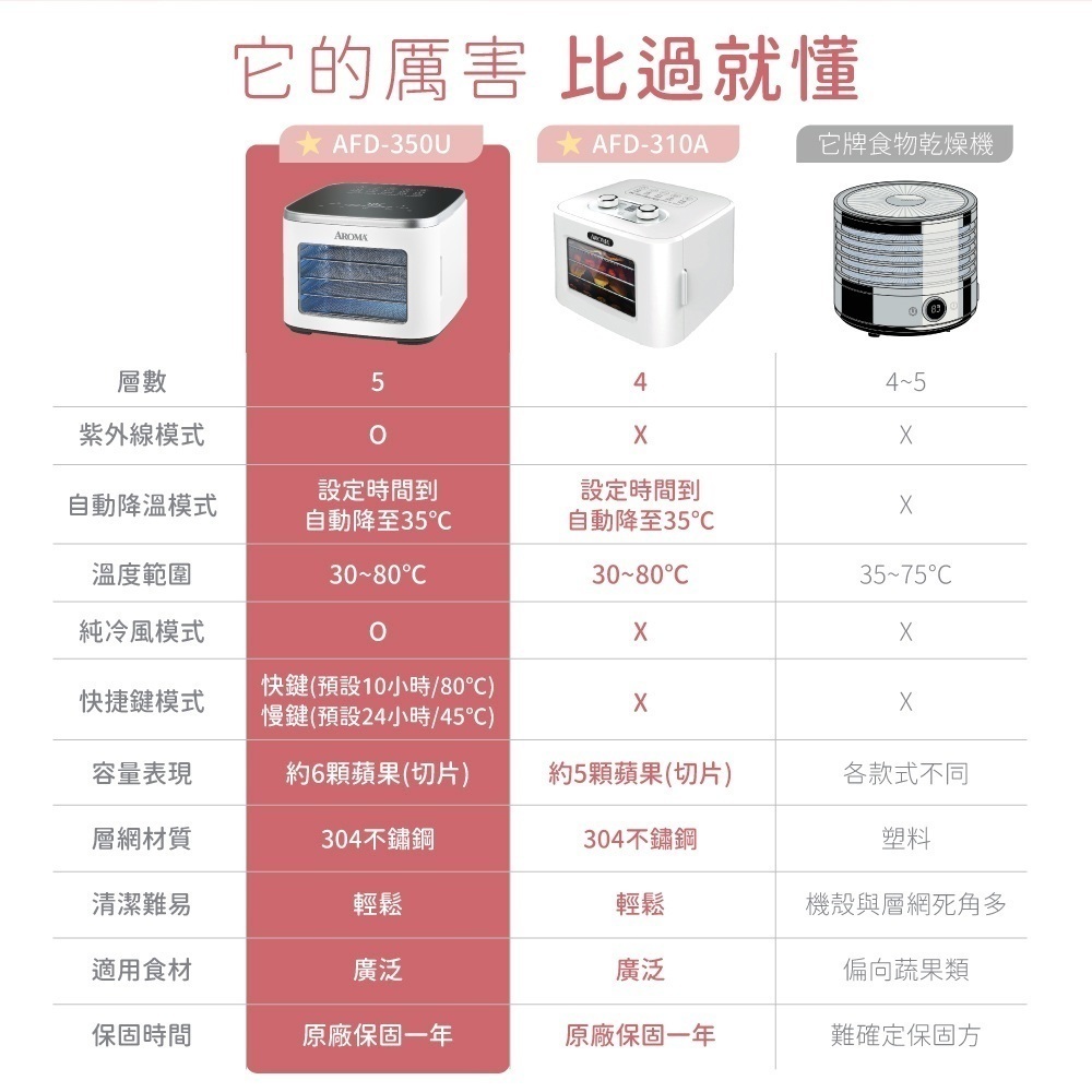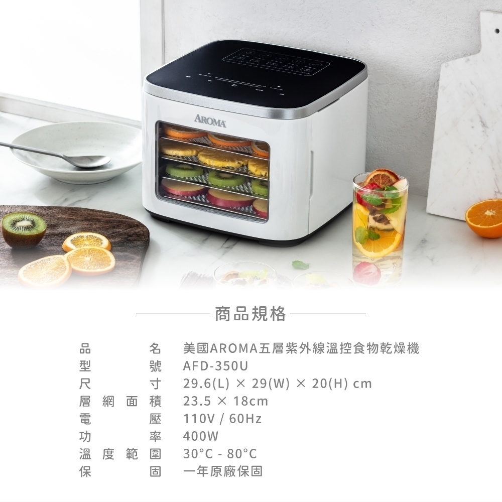 .六層紫外線全金屬單腔款.型號:AFD-965SDU (六層).溫度:30~80 度.體積:高 34 cm x 長 45 cm x 寬 31 cm.層網:長 30 cm x 寬 30 cm.淨重:10.5kg.配件:304 不鏽鋼層網*6、PP 細格網*1、PP 承接盤*1.電費:開機 10 小時不到 20 元.十層紫外線全金屬單腔款.型號:AFD-925SDU (十層).溫度:30~75 度.體積:高 41.7 cm x 長 53 cm x 寬 43 cm.層網:長 39 cm x 寬 39 cm.淨重:17kg.配件:304 不鏽鋼層網*10、PP 細格網*1、PP 承接盤*1.電費:開機 10 小時不到 30 元