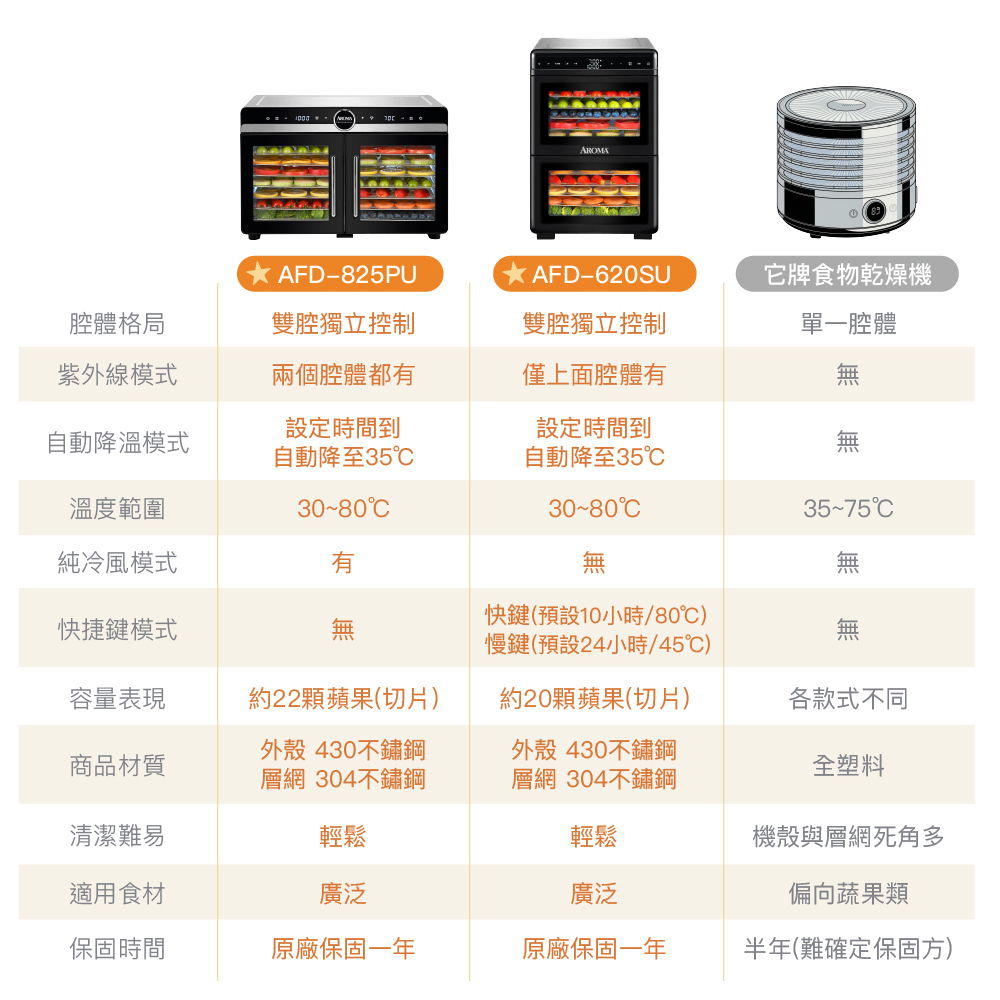 .自動降溫功能|烘乾完畢,自動偵測腔內溫度,低於 35 度才會停止風扇運轉;迅速降溫、避免回潮!.加裝紫外線滅菌燈.雙腔獨立設計|兩個腔體可獨立設定 溫度、時間 與 紫外線模式,讓您同時多功處理.十二層紫外線全金屬雙腔款.型號:AFD-620SU.溫度:30~80 度.體積:高 41.5 cm x 長 31 cm x 寬 36.8 cm.層網:長 27.5 cm x 寬 25 cm.淨重:14 kg.配件:304 不鏽鋼層網*12、細格網*2、承接盤*2.電費:開機 10 小時不到 30 元